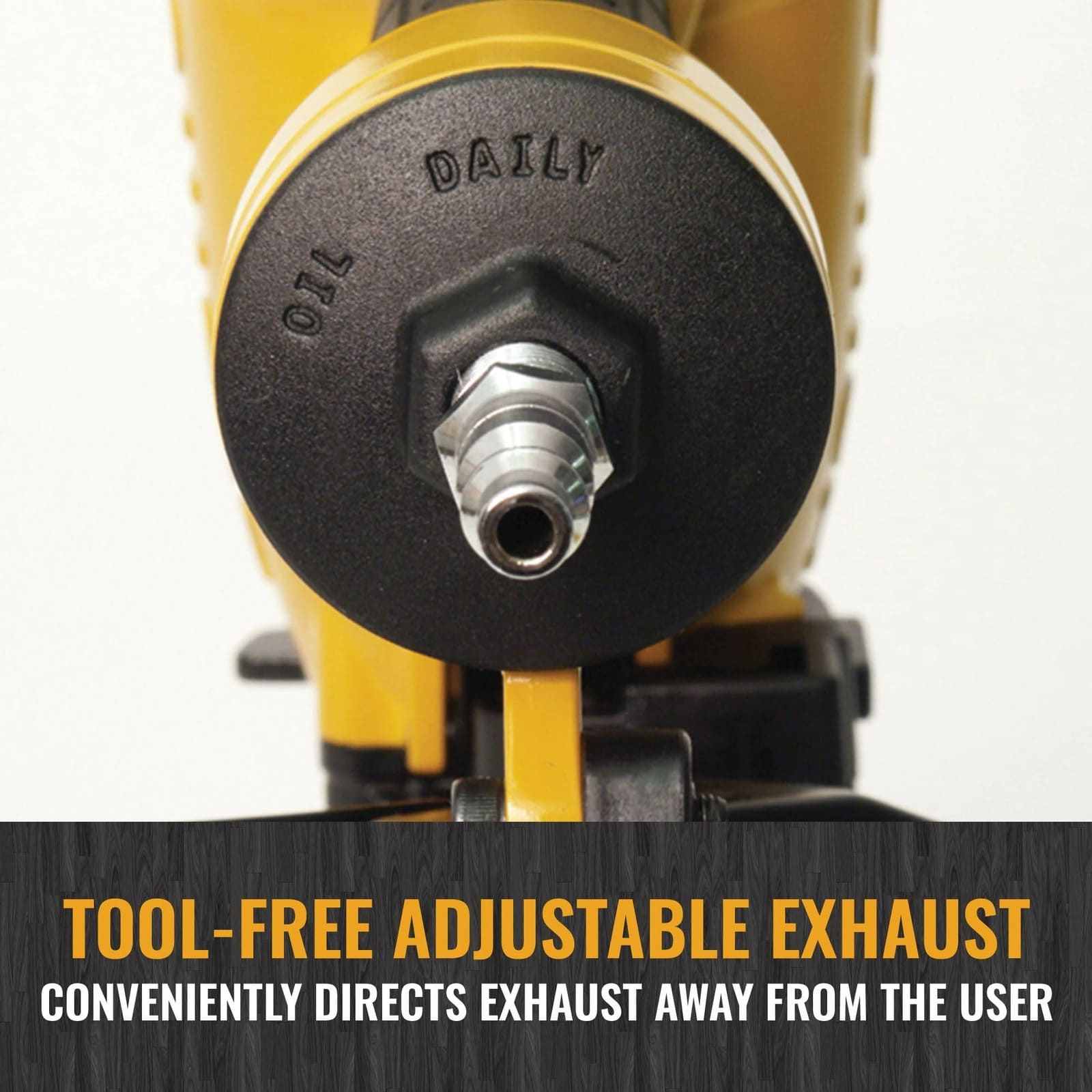 Tool-free adjustable exhaust conveniently directs exhaust away from the user