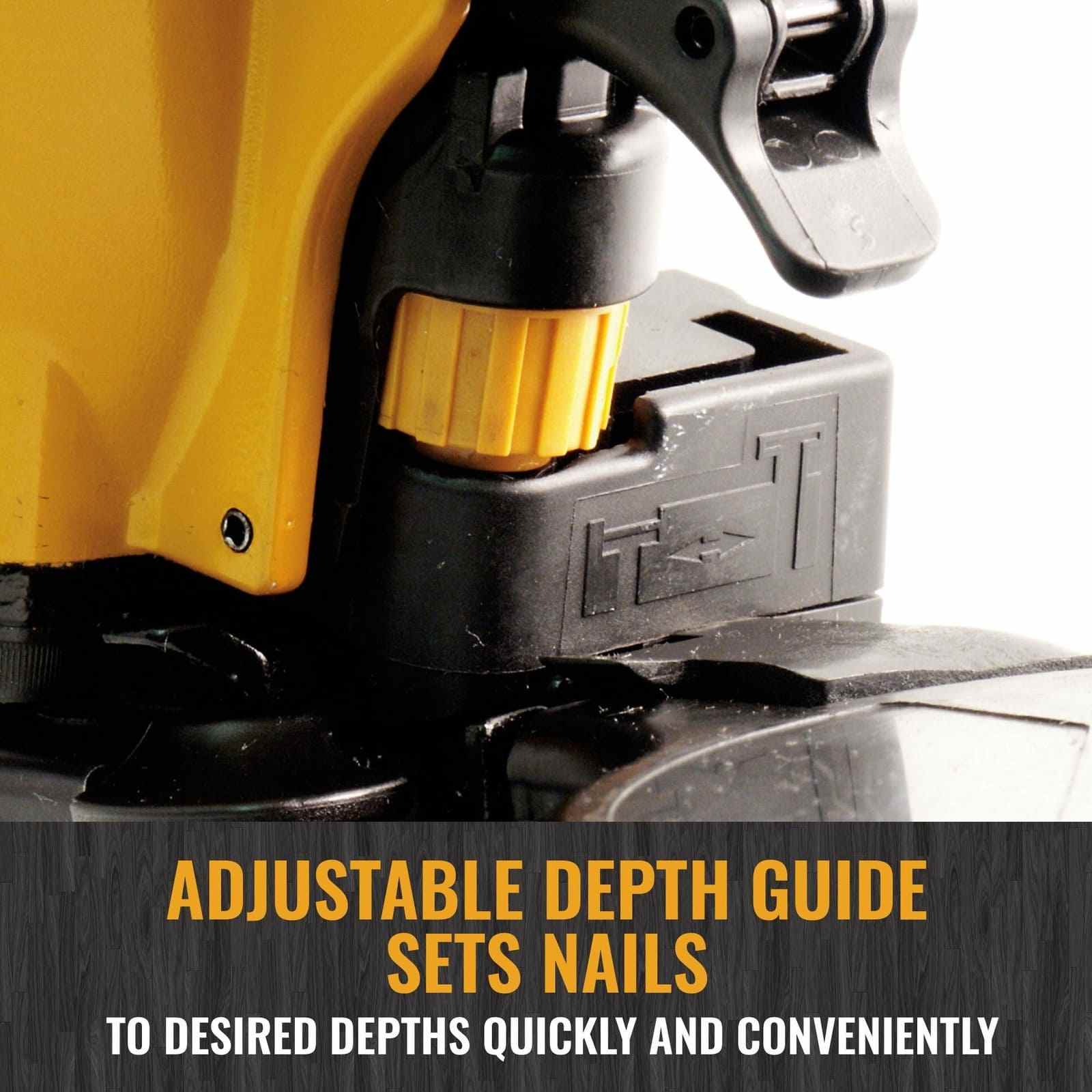 Adjustable depth guide sets nails to desired depths quickly and conveniently